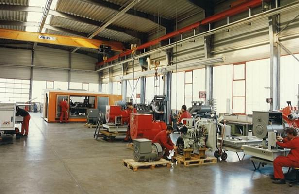 Nach der Erweiterung des Bürogebäudes 1987 folgte fünf Jahre später eine neue Montagehalle als logische Konsequenz. Diese war aufgrund der Vielzahl an Aufträgen und Größe der Einheiten dringend erforderlich. Die Besonderheit: eine Fußbodenheizung. Was für eine Montagehalle eher unüblich erscheint, resultiert aus den Probeläufen der Aggregate. Die dadurch erzeugte Energie, wird in einem Speicher in Wärme umgewandelt und abgelegt. Mit der alten Halle standen nun insgesamt 2.450 m2 zur Verfügung.